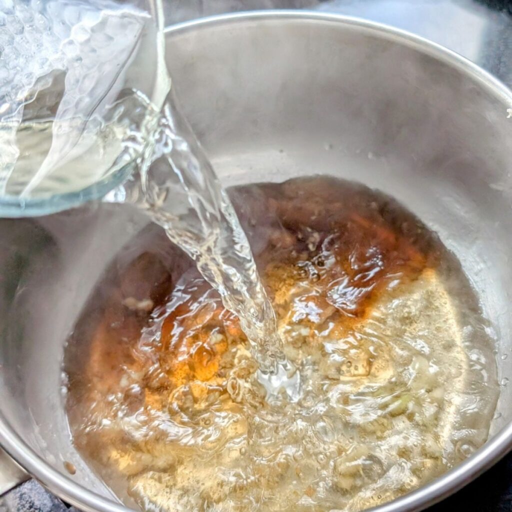 Step 3: Pour in the water (or vegetable stock) and the sriracha, and bring to a boil.